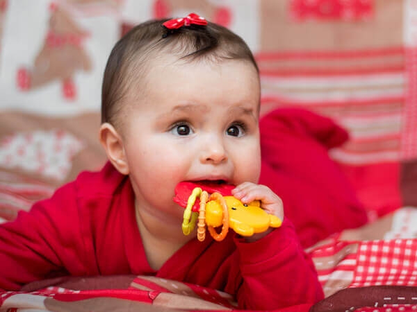 Nie przejmuj się, gdy temperatura ciała malca jest nieco podwyższona – jest to częsty objaw ząbkowania. Skonsultuj się jednak z lekarzem jeśli podwyższonej temperaturze towarzyszyć będzie biegunka, kaszel lub wymioty.